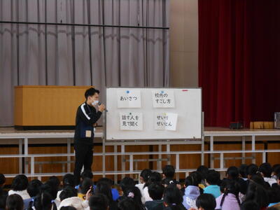 いつも通り、体育館中に元気のよい朝のあいさつが響きわたり、校長先生のお話と今月の目標のお話を真剣にしっかりと聞くことができました。