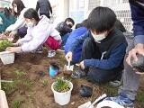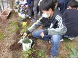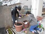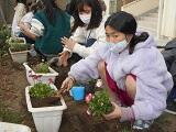 卒業・進級も近づいてきて毎年この時期に花壇や鉢に花を植えて学校に彩りをつくっています。今年も環境委員の児童と厚生委員の方と一緒に花植を行いました。50個ほどあったお花の苗も一つ一つ丁寧に植え換えを行いました。